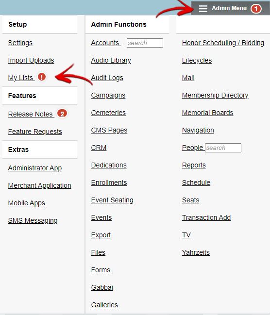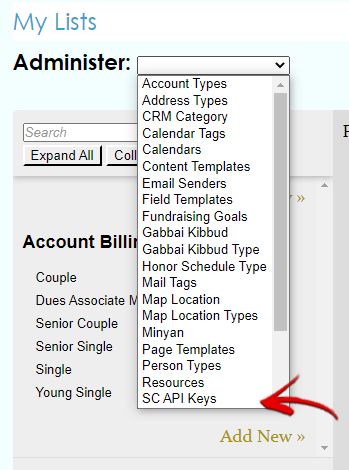 First we need to set up an API permission within Shulcloud so that Yahrzeit Interactive can have access to your accounts data. To do this first log into your Shulcloud Admin account and select Admin > My Lists > Administer > SC API Keys