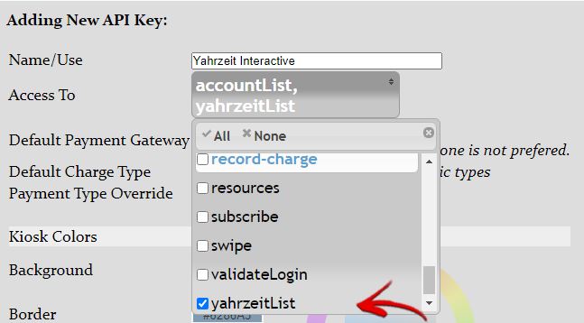 In the Access menu for the API Key - disable all access by selecting “None” and then give this key access only to the Yahrzeit List and if you want to send emails through Yahrzeit Interactive give access to the Account List.