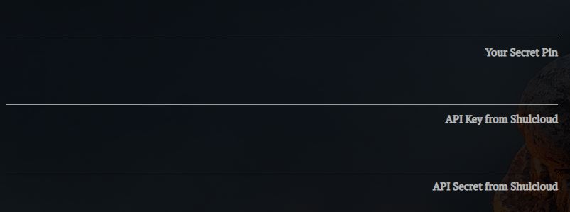 First we will need to enter in the API Key and Secret to your YI database. Yahrzeit Interactive encrypts these keys with a numerical PIN of your choosing.