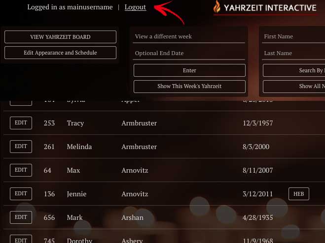 Make sure that your most recent changes have been saved. Then click the “Logout” button in the top left corner of the main screen. Note that any changes you have entered into the system will not appear on the touchscreen until the following day. To display these changes instantly, follow the “invisible button” procedure.