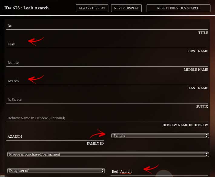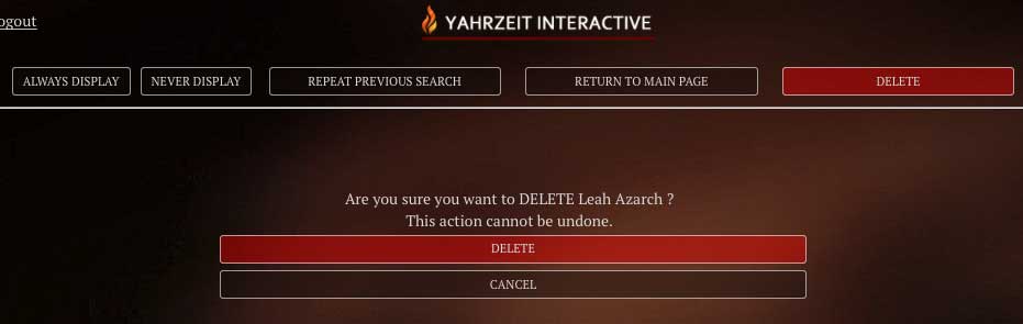If you wish to permanently remove a name from the touchscreen and the yahrzeit database, bring up the individual’s “Edit” page, hit the red “DELETE” button at the top, then confirm that you wish to delete. Remember, this action cannot be undone.
