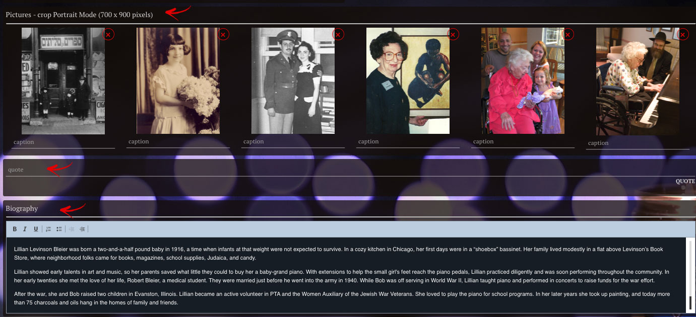 At the bottom of the “Add a Name” or “Edit a Name” page, you can input photos and/or a biography. These elements will display on the individual’s personal memorial page.