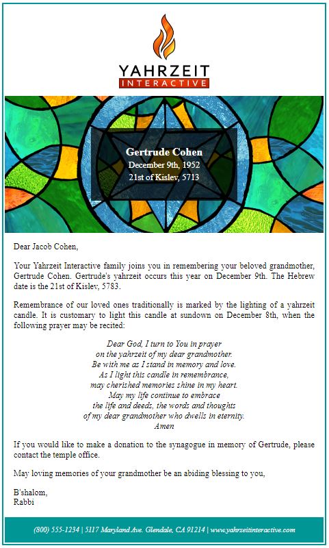 Yahrzeit Interactive can send Yahrzeit Reminder emails to any observer or mourner in our system with a valid email address. The Reminder Email system is disabled by default - please contact Yahrzeit Interactive to enable Reminder Emails and so we can assist you in setting up your reminder letter.