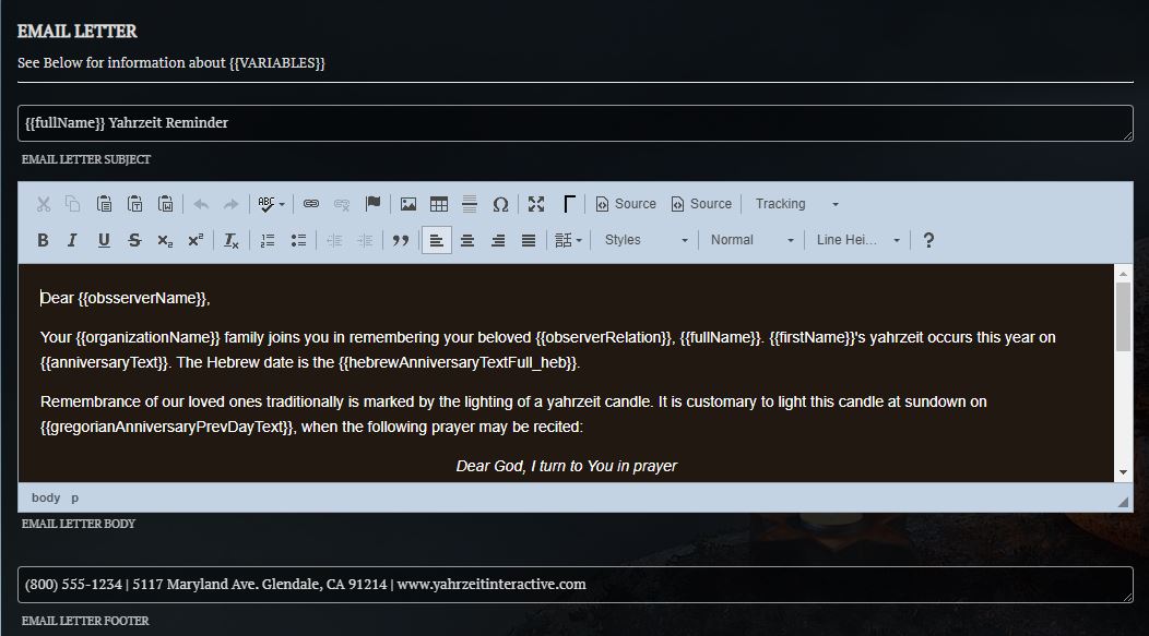Using Variables in your letter text allows us to dynamically replace certain general ideas, ie. {{fullName}} or {{yahrzeitDate}}, with specific, unique information in each letter. Yahrzeit Interactive supports a very, very long list of variables and these can be found at the bottom of the Email Settings page.