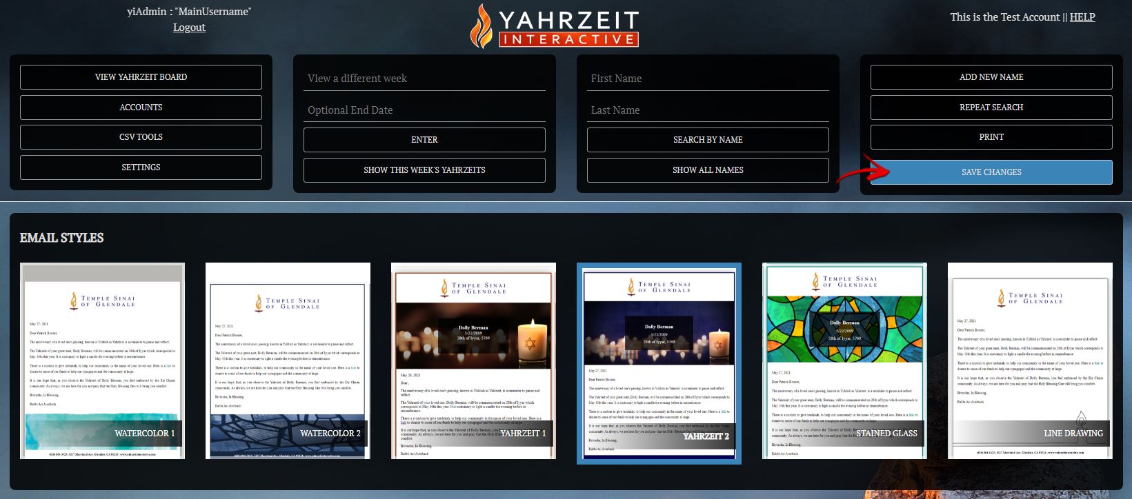 Yahrzeit Interactive allows you to send a demonstration email at any time to an email address of your choosing. Navigate to the Send Test Email section - input an email address to send the test letter to - and hit send.