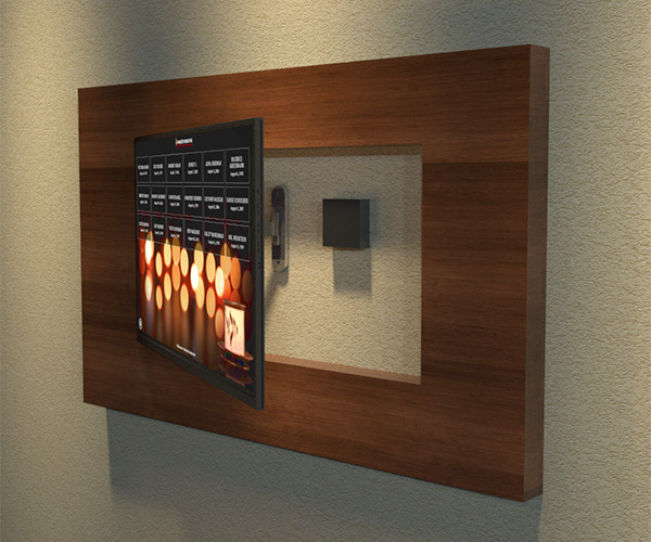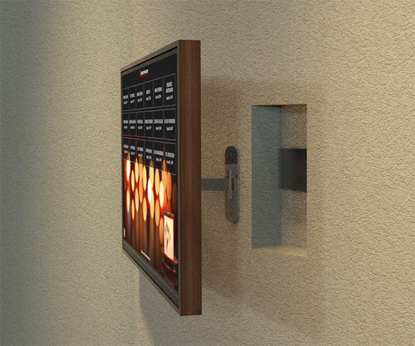 The micro-computer can be concealed behind the screen, in a recessed box in the wall. By mounting the screen to an articulating arm your synagogue’s yahrzeit administrator can easily access the computer when necessary.